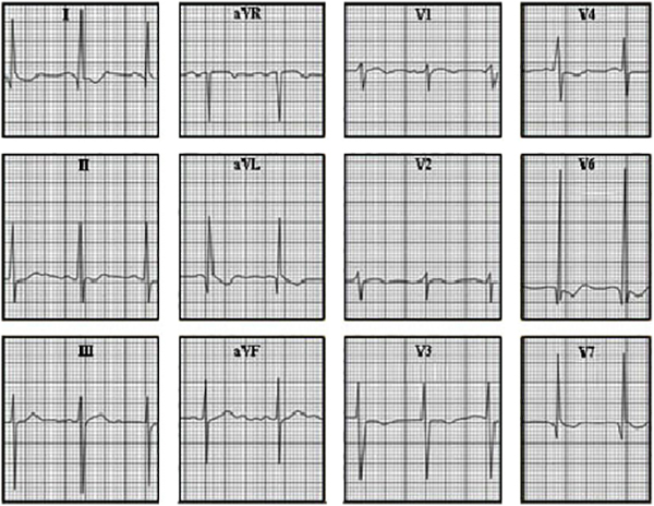 ST depression and negative T waves in leads I and V4 through V7, indicating the repolarization changes.