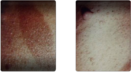 The patient's general appearance may, on rare occasions, provide a clue to the diagnosis of pheochromocytoma. In a small percentage of patients with the rare genetic condition neurofibromatosis, pheochromocytoma may be present. These photographs demonstrate cafe-au-lait spots (image on the left) and cutaneous neurofibromata (image on the right) in such a patient.