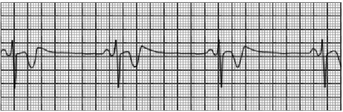 PR interval is constant. In this example, the T waves are abnormal. This rhythm is common in patients with inferior wall infarction.