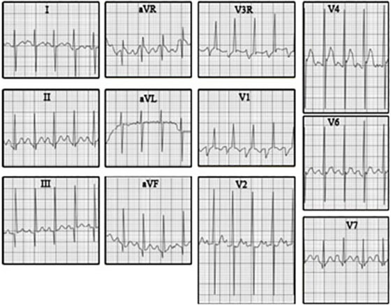 tall, dominant R waves in leads V3R and V1.