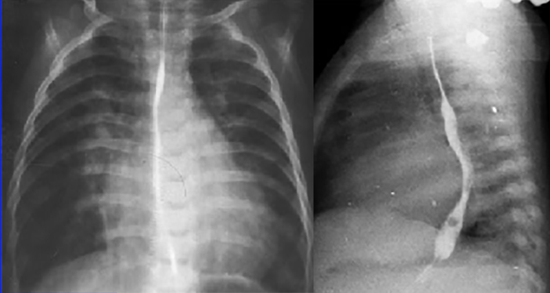 It is more definitively demonstrated in the lateral view by the posterior deviation of the barium filled